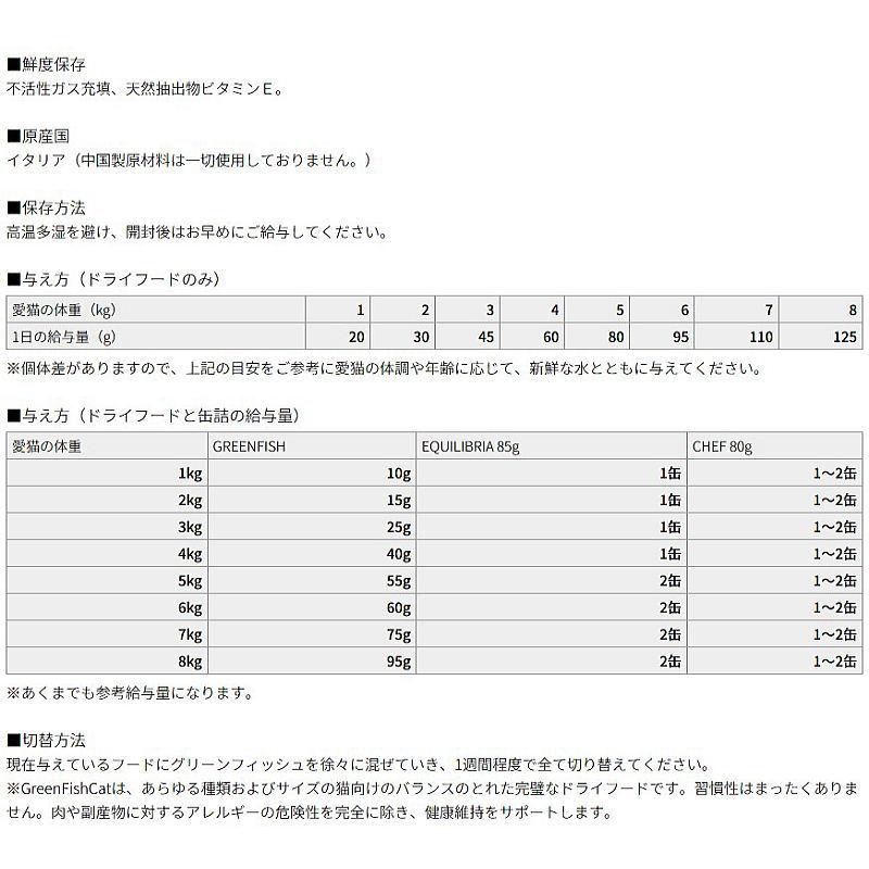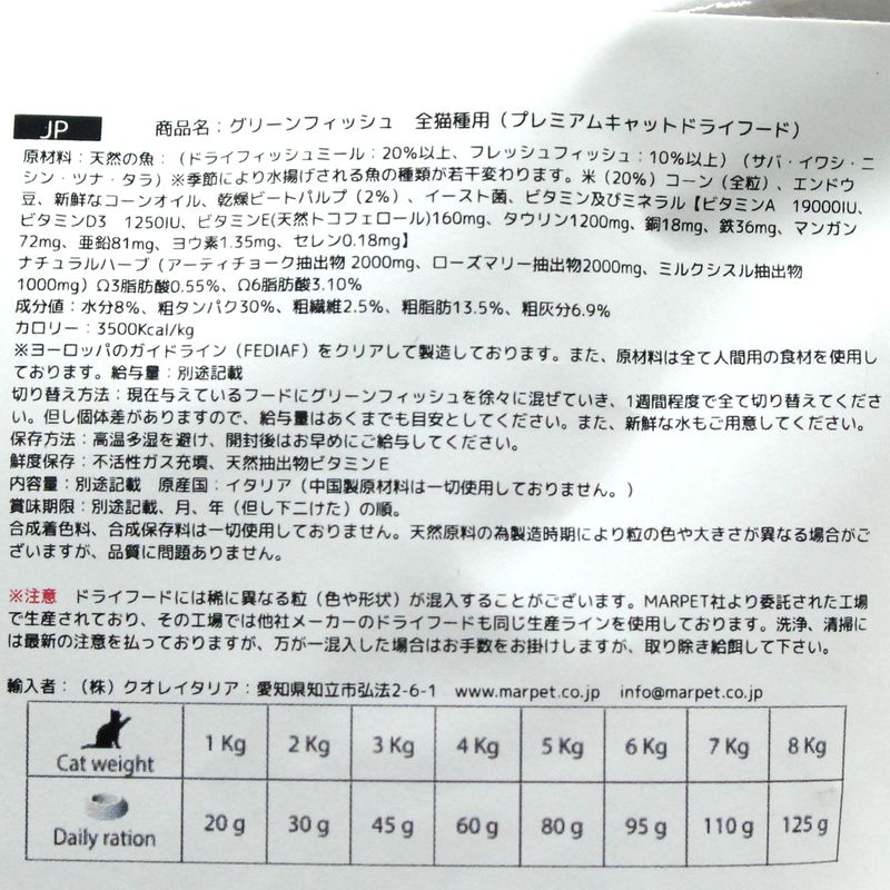 ※GreenFishCatは、あらゆる種類およびサイズの猫向けのバランスのとれた完璧なドライフードです。習慣性はまったくありません。肉や副産物に対するアレルギーの危険性を完全に除き、健康維持をサポートします。