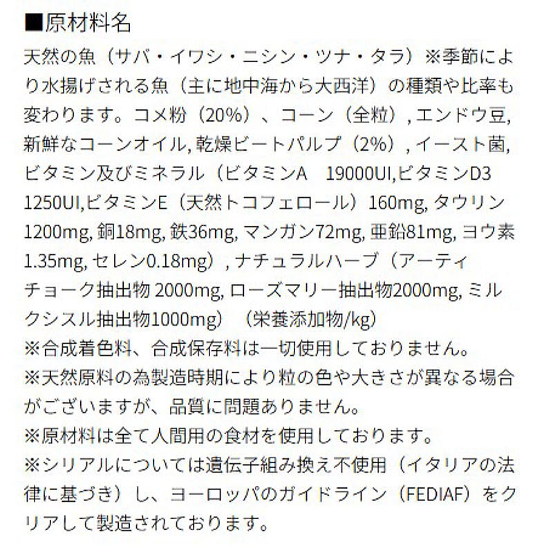 ■原材料名:天然の魚(サバ・イワシ・ニシン・ツナ・タラ)※季節により水揚げされる魚(主に地中海から大西洋)の種類や比率も変わります。コメ粉(20%)、コーン(全粒), エンドウ豆, 新鮮なコーンオイル, 乾燥ビートパルプ(2%), イースト菌, ビタミン及びミネラル(ビタミンA 19000UI,ビタミンD3 1250UI,ビタミンE(天然トコフェロール)160mg, タウリン1200mg, 銅18mg, 鉄36mg, マンガン72mg, 亜鉛81mg, ヨウ素1.35mg, セレン0.18mg), ナチュラルハーブ(アーティチョーク抽出物 2000mg, ローズマリー抽出物2000mg, ミルクシスル抽出物1000mg)(栄養添加物/kg)