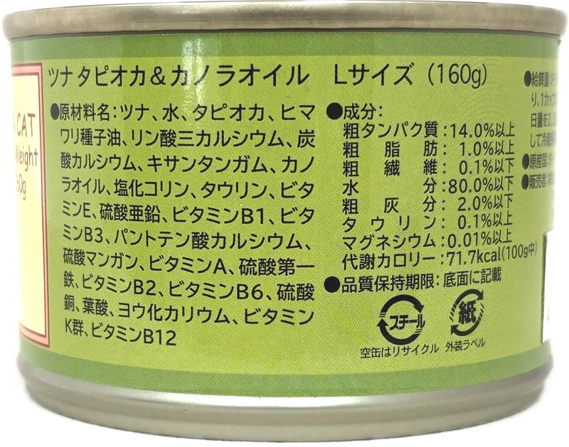 原材料:ツナ、水、タピオカ、ヒマワリ種子油、リン酸三カルシウム、炭酸カルシウム、キサンタンガム、カノラオイル、塩化コリン、タウリン、ビタミンE、硫酸亜鉛、ビタミンB1、ビタミンB3、パントテン酸カルシウム、硫酸マンガン、ビタミンA、硫酸第一鉄、ビタミンB2、ビタミンB6、硫酸銅、葉酸、ヨウ化カリウム、ビタミンK群、ビタミンB12