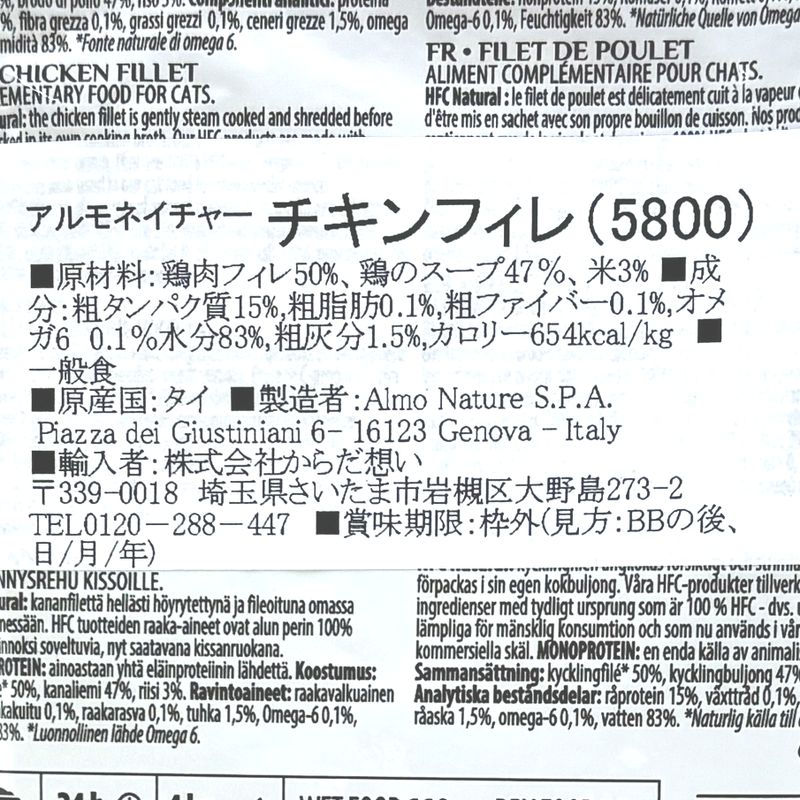 原材料:鶏肉フィレ50%、鶏のスープ47%、米3%