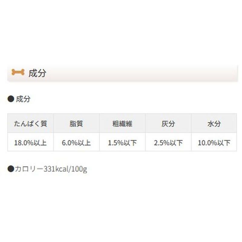成分:たんぱく質 18.0%以上、脂質 6.0%以上、粗繊維 1.5%以下、灰分 2.5%以下、水分 10.0%以下