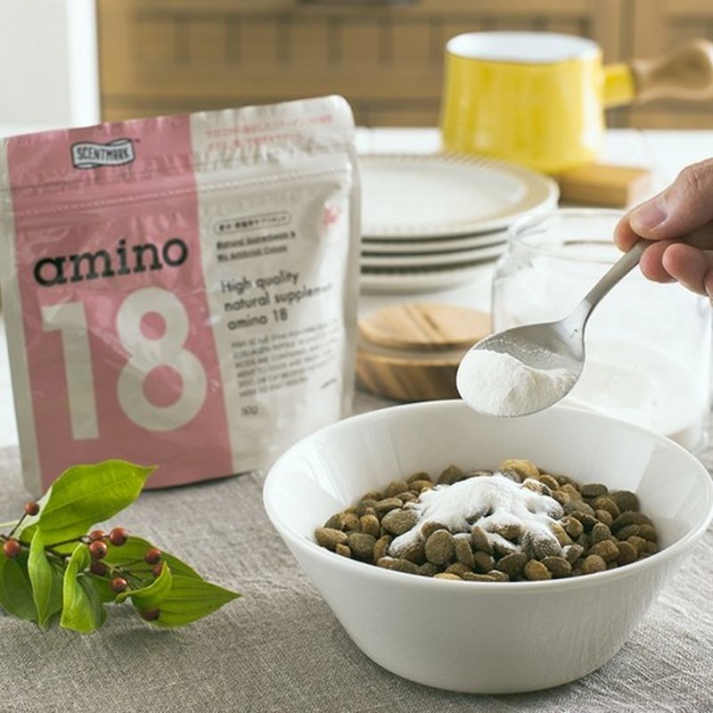 粉末がフードに混ざりにくい時は、一旦ドライフードを少量の水で湿らせた後、「アミノ18」をふりかけてください。そうすることで粉末がフードにうまく絡まり食事がしやすくなりますよ(^^)
