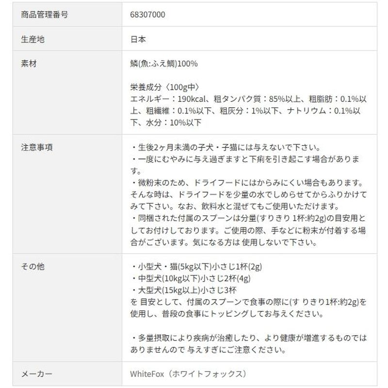 ・微粉末のため、ドライフードにはからみにくい場合もあります。そんな時は、ドライフードを少量の水でしめらせてからふりかけてみて下さい。