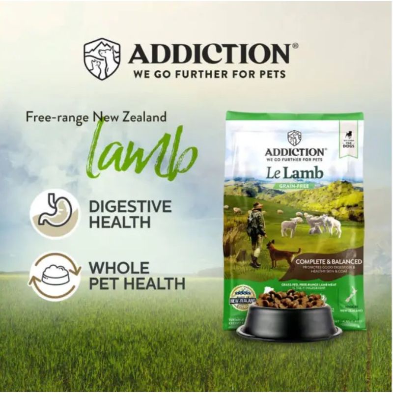 アディクション ル・ラム(ラム肉)は、ニュージーランド産フリーレンジラム肉と、様々なハーブ類、日光を沢山浴びたベリー類、プロバイオティクスを配合したグレインフリーフード。