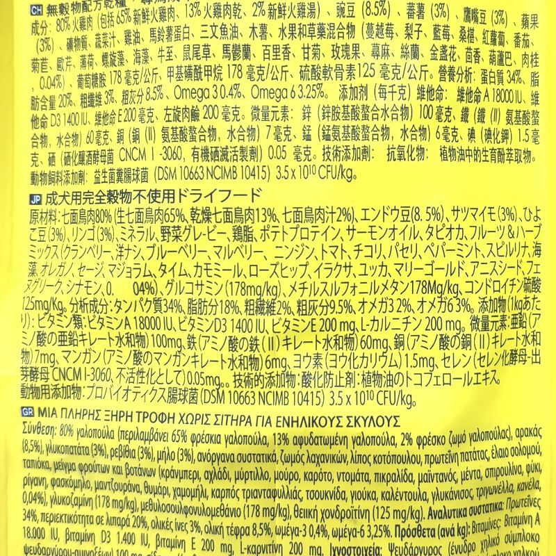 原材料:80% ターキー(ターキー 生肉 65%、脱水ターキー 13%、ターキーグレイビー 2%)、エンドウ、サツマイモ、ヒヨコマメ、リンゴ、ミネラル類、ベジタブルグレイビー、鶏脂、ポテトプロテイン、サーモンオイル、タピオカ、フルーツ&サーモンミックス(クランベリー、ナシ、ブルーベリー、マルベリー、ニンジン、トマト、チコリ、パセリ、ペパーミント、スピルリナ、海藻、オレガノ、セージ、マジョラム、タイム、カモミール、ローズヒップ、セイヨウイラクサ、ユッカ、マリゴールド、アニス果、フェヌグリーク、シナモン)グルコサミン 178mg/kg、MSM 178mg/kg、コンドロイチン 125mg/kg、酸化防止剤(トコフェロール)エンテロコッカスフェシウム C-3102 株(DSM 10663)3.5x1010 CFU