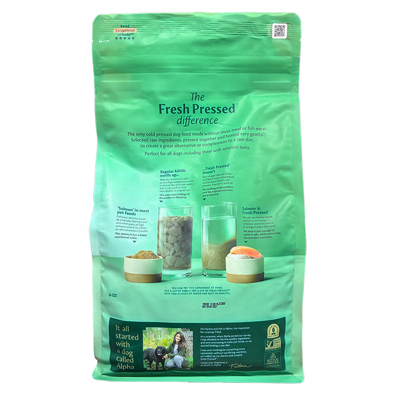 原材料:フレッシュサーモン35%、スイートポテト35%、加水分解タラ10%、全卵8%、ビートファイバー3.05%、ビール酵母2.5%、リグノスルホン酸塩1.725%、サンフラワーオイル1.55%、ビタミン類1.232%、サーモンオイル0.5%、イヌリン0.5%、ミネラル類0.25%、ハーブブレンド0.25%(パセリ、ローズマリー、イラクサ、カモミール、セージ、タイム、コリアンダーの葉、タンポポの葉、カンゾウ)、トコフェロール抽出物(酸化防止剤)0.25%、グルコサミン0.098%、緑イ貝0.05%、コンドロイチン硫酸0.045%