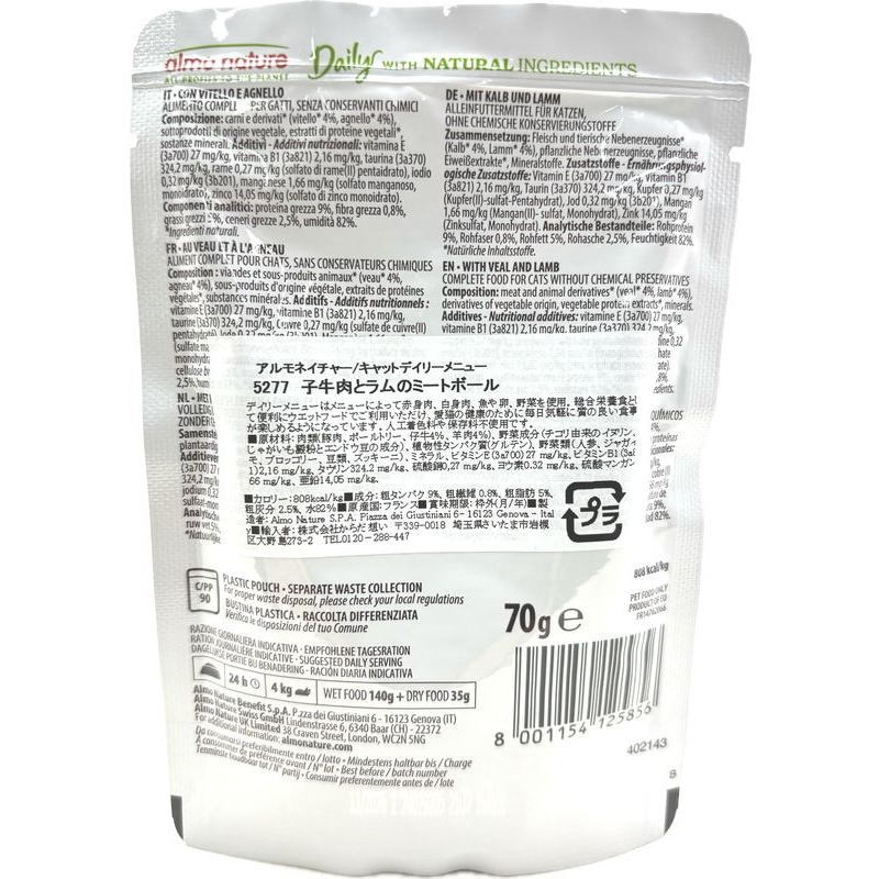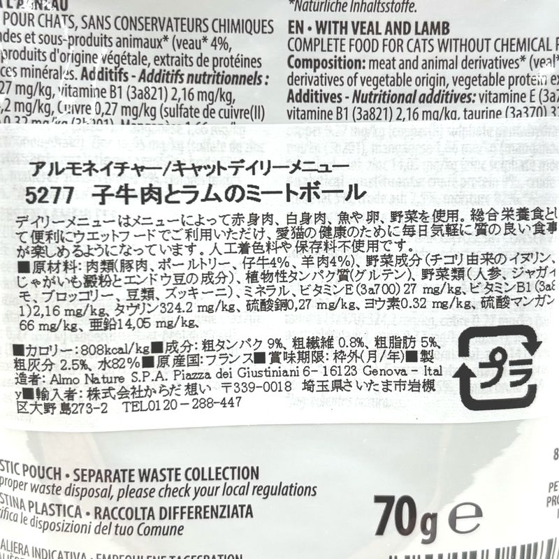 最短賞味2027.1・アルモネイチャー 猫 デイリーメニュー 子牛肉とラムのミートボール 70gパウチalc5277成猫/総合栄養食