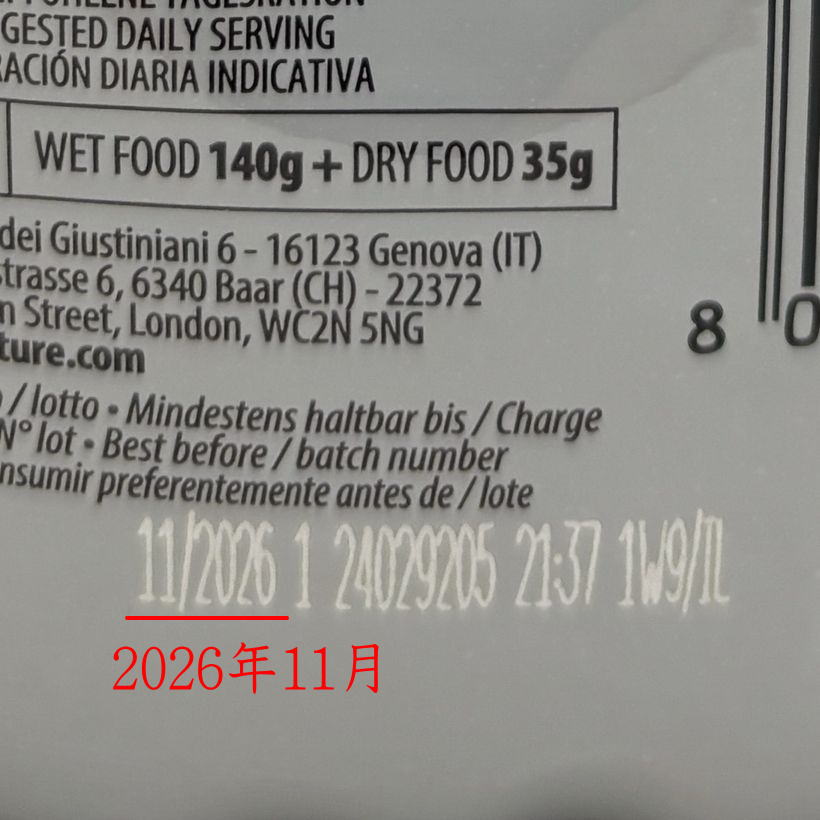 原材料:肉類(豚肉、ポールトリー、仔牛4%、羊肉4%)、野菜成分(チコリ由来のイヌリン、じゃがいも澱粉とエンドウ豆の成分)、植物性タンパク質(グルテン)、野菜類(人参、ジャガイモ、ブロッコリー、豆類、ズッキーニ)、ミネラル、ビタミンE(3a700)27mg/kg、ビタミンB1(3a821)2,16mg/kg、タウリン324.2 mg/kg、硫酸銅0,27mg/kg、ヨウ素0,32mg/kg、硫酸マンガン66mg/kg、亜鉛14.05mg/kg