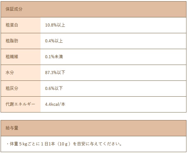 保証成分:粗蛋白 10.8%以上、粗脂肪 0.4%以上、粗繊維 0.1%未満、水分 87.3%以下、粗灰分 0.6%以下