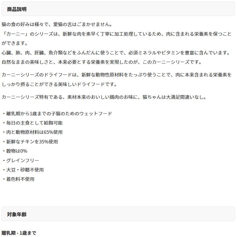 カーニーシリーズ特有である、素材本来のおいしい鶏肉のお味に、猫ちゃんは大満足間違いなし。