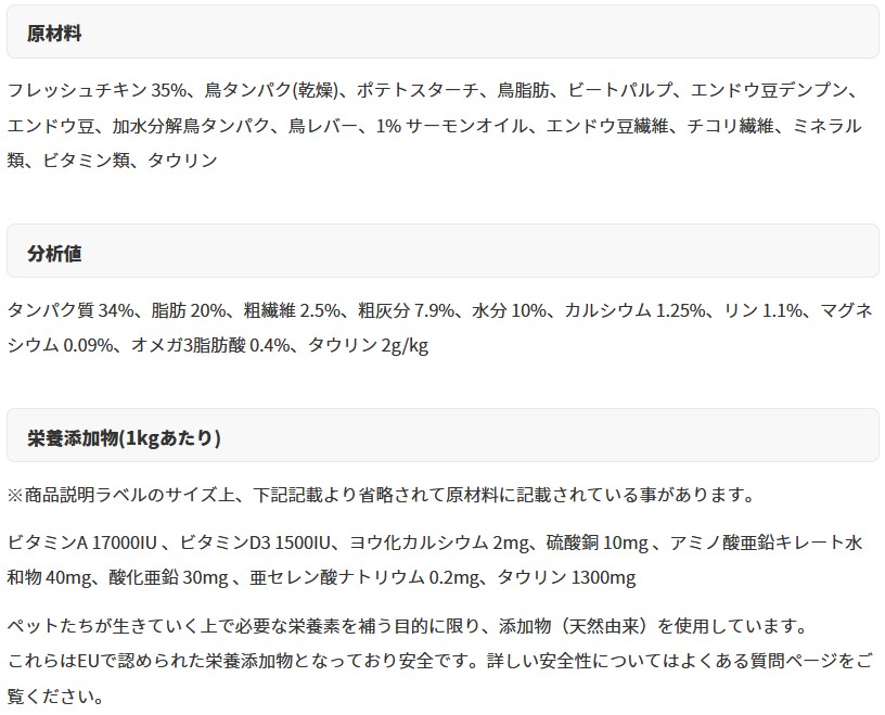原材料:フレッシュチキン 35%、鳥タンパク(乾燥)、ポテトスターチ、鳥脂肪、ビートパルプ、エンドウ豆デンプン、エンドウ豆、加水分解鳥タンパク、鳥レバー、1% サーモンオイル、エンドウ豆繊維、チコリ繊維、ミネラル類、ビタミン類、タウリン
