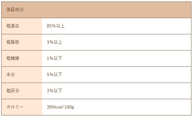 保証成分:粗蛋白質 85%以上、粗脂肪 3%以上、粗繊維 1%以下、粗灰分 3%以下、水分 5%以下