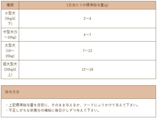 ・上記標準給与量を目安に、そのまま与えるか、フードにふりかけて与えて下さい。