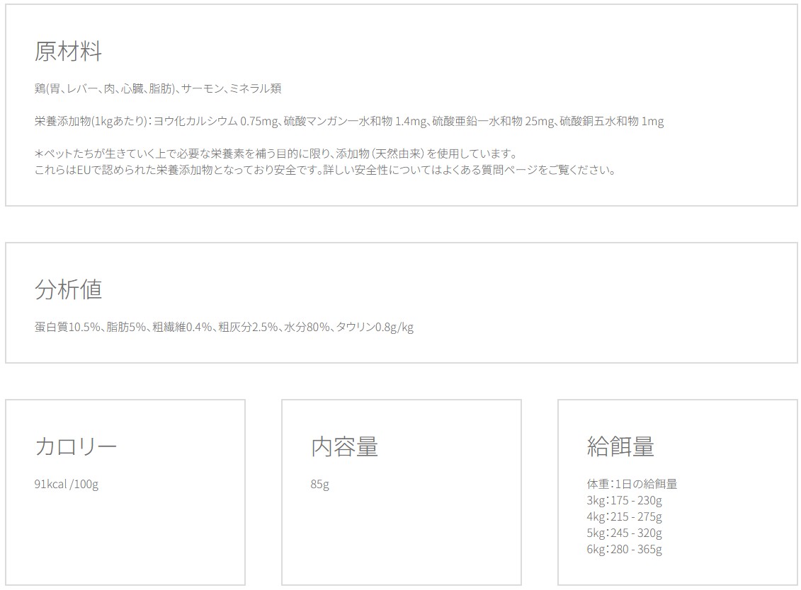 原材料:鶏(胃、レバー、肉、心臓、脂肪)、サーモン、ミネラル類