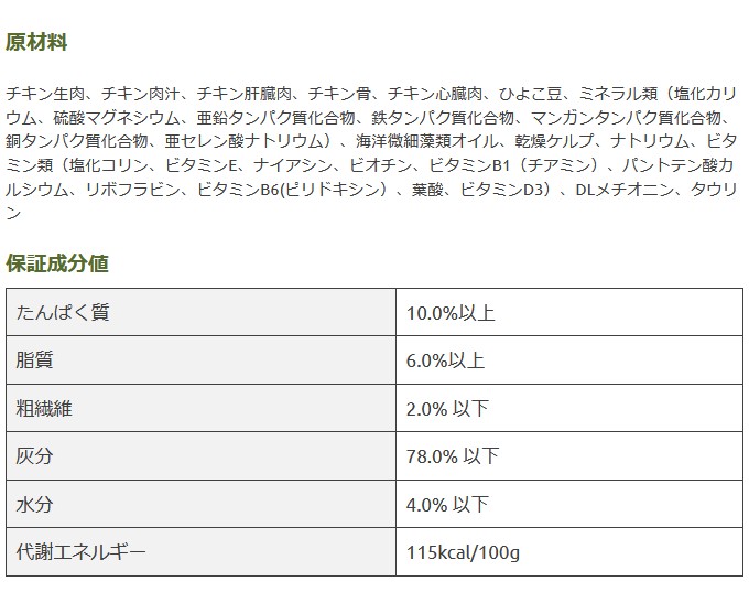 原材料:チキン生肉、チキン肉汁、チキン肝臓肉、チキン骨、チキン心臓肉、ひよこ豆、ミネラル類(塩化カリウム、硫酸マグネシウム、亜鉛タンパク質化合物、鉄タンパク質化合物、マンガンタンパク質化合物、銅タンパク質化合物、亜セレン酸ナトリウム)、海洋微細藻類オイル、乾燥ケルプ、ナトリウム、ビタミン類(塩化コリン、ビタミンE、ナイアシン、ビオチン、ビタミンB1(チアミン)、パントテン酸カルシウム、リボフラビン、ビタミンB6(ピリドキシン)、葉酸、ビタミンD3)、DLメチオニン、タウリン