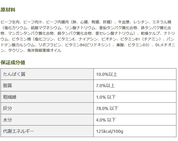 原材料:ビーフ生肉、ビーフ肉汁、ビーフ内臓肉(肺、心臓、腎臓、肝臓)、牛血漿、レシチン、ミネラル類(塩化カリウム、硫酸マグネシウム、リン酸ナトリウム、亜鉛タンパク質化合物、鉄タンパク質化合物、マンガンタンパク質化合物、銅タンパク質化合物、亜セレン酸ナトリウム)、乾燥ケルプ、ナトリウム、ビタミン類(塩化コリン、ビタミンE、ナイアシン、ビオチン、ビタミンB1(チアミン)、パントテン酸カルシウム、リボフラビン、ビタミンB6(ピリドキシン)、葉酸、ビタミンD3)、DLメチオニン、タウリン、海洋微細藻類オイル