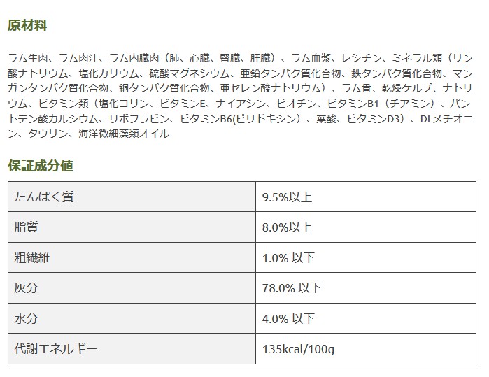 原材料:ラム生肉、ラム肉汁、ラム内臓肉(肺、心臓、腎臓、肝臓)、ラム血漿、レシチン、ミネラル類(リン酸ナトリウム、塩化カリウム、硫酸マグネシウム、亜鉛タンパク質化合物、鉄タンパク質化合物、マンガンタンパク質化合物、銅タンパク質化合物、亜セレン酸ナトリウム)、ラム骨、乾燥ケルプ、ナトリウム、ビタミン類(塩化コリン、ビタミンE、ナイアシン、ビオチン、ビタミンB1(チアミン)、パントテン酸カルシウム、リボフラビン、ビタミンB6(ピリドキシン)、葉酸、ビタミンD3)、DLメチオニン、タウリン、海洋微細藻類オイル