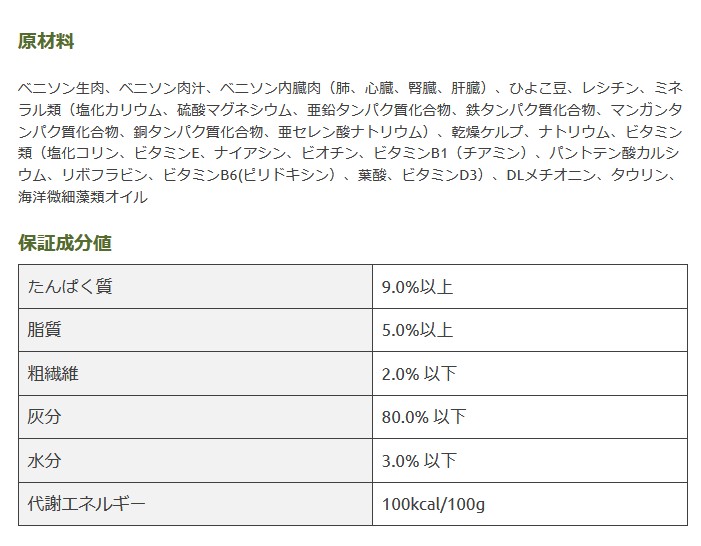 原材料:ベニソン生肉、ベニソン肉汁、ベニソン内臓肉(肺、心臓、腎臓、肝臓)、ひよこ豆、レシチン、ミネラル類(塩化カリウム、硫酸マグネシウム、亜鉛タンパク質化合物、鉄タンパク質化合物、マンガンタンパク質化合物、銅タンパク質化合物、亜セレン酸ナトリウム)、乾燥ケルプ、ナトリウム、ビタミン類(塩化コリン、ビタミンE、ナイアシン、ビオチン、ビタミンB1(チアミン)、パントテン酸カルシウム、リボフラビン、ビタミンB6(ピリドキシン)、葉酸、ビタミンD3)、DLメチオニン、タウリン、海洋微細藻類オイル