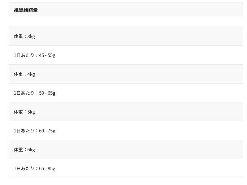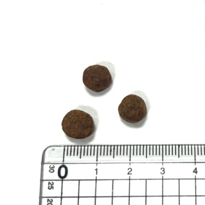 分析値:タンパク質34%、脂肪14%、粗繊維3%、粗灰分7.5%、水分7%、カルシウム1.1%、リン0.7%、オメガ3脂肪酸0.65%、タウリン2.85g/kg