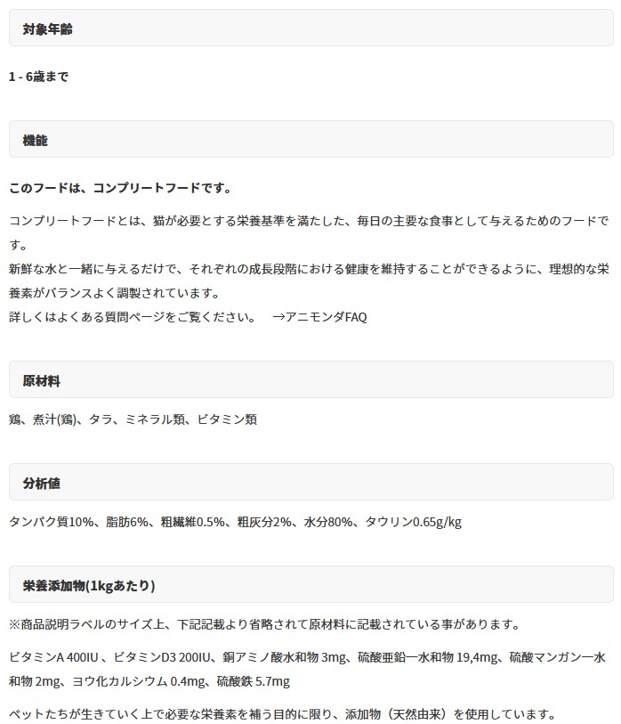 分析値:タンパク質10%、脂肪6%、粗繊維0.5%、粗灰分2%、水分80%、タウリン0.65g/kg