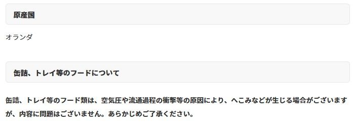 缶詰、トレイ等のフード類は、空気圧や流通過程の衝撃等の原因により、へこみなどが生じる場合がございますが、内容に問題はございません。あらかじめご了承ください。