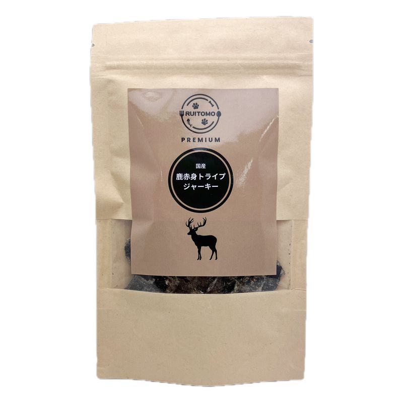 鹿肉赤身トライプジャーキーは、低脂肪で高タンパクな鹿の赤身肉をベースに、今注目のスーパーフード「トライプ」を贅沢にブレンドしたプレミアムなおやつです。