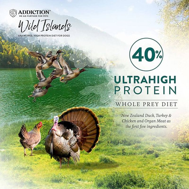 アイランドバーズのタンパク質は40%です。穀物、ジャガイモ、トウモロコシ、大豆、小麦は含まれていません。アイランドバーズは風味豊かで消化しやすいプレミアムダックで作られています。最適な新しいタンパク質である、プレミアムな鴨生肉・七面鳥生肉・鶏生肉・鶏生レバーと栄養が豊富な緑イ貝、抗酸化作用のあるマヌカハニー、ビタミンCが豊富なキウイフルーツを使用して作られています。愛犬に栄養価の高い、高たん白質で低糖質な野生の犬本来の食事を提供します。