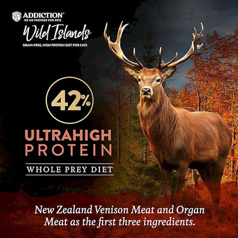 フォレストミートレシピのタンパク質は42%です。穀物、ジャガイモ、トウモロコシ、大豆、小麦は含まれていません。フォレストミートレシピは、最適な新しいタンパク質である、プレミアムなフリーレンジのニュージーランド鹿生肉・鹿生ハート・鹿生トライプと栄養が豊富な緑イ貝、抗酸化作用のあるマヌカハニー、ビタミンCが豊富なキウイフルーツを使用して作られています。愛猫に栄養価の高い、高たん白質で低糖質な野生の猫本来の食事を提供します。
