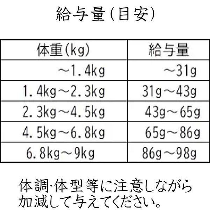 保証成分値:たん白質 42%以上、脂質 15%以上、繊維 5%以下、灰分 10%、水分 10%以下