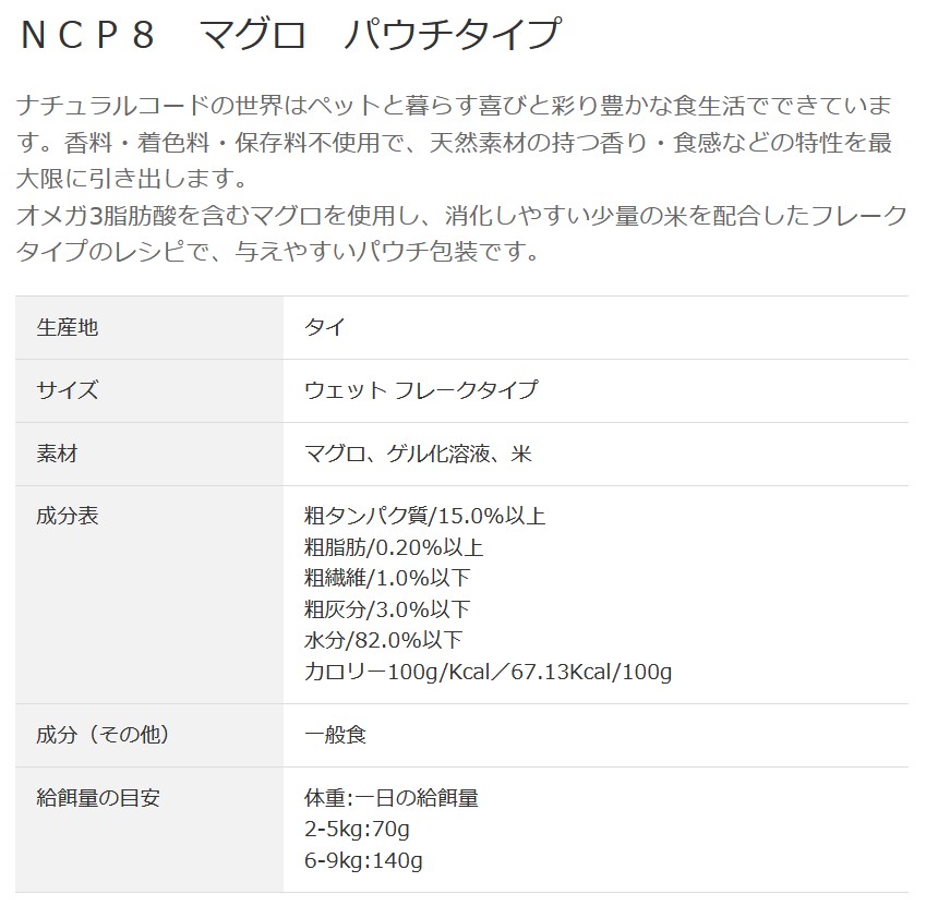 - > NEW 最短賞味2028.1・ナチュラルコード 猫 NCP8 マグロ パウチ24個セットnco52147s24成猫用一般食 正規品/SALE