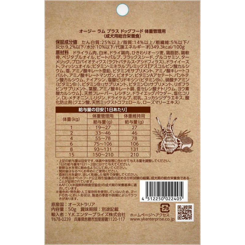 - > NEW 最短賞味2026.10.17・オージー ラム プラス 体重管理用50g成犬用Aussie Lamb Plus正規品alp22405