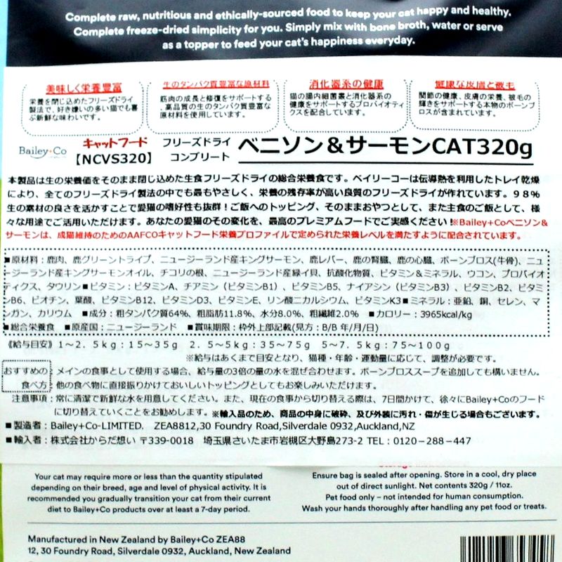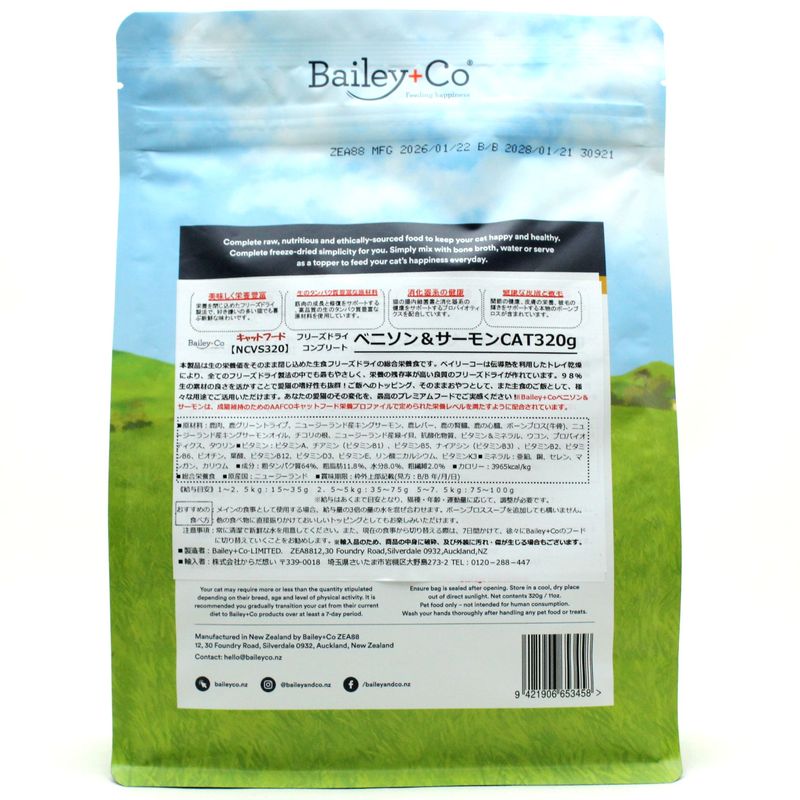 - > NEW 最短賞味2028.1.21・ベイリーコー 猫フリーズドライ コンプリート ベニソン&サーモン 320g全年齢猫用Bailey+Co正規品bacncvs320