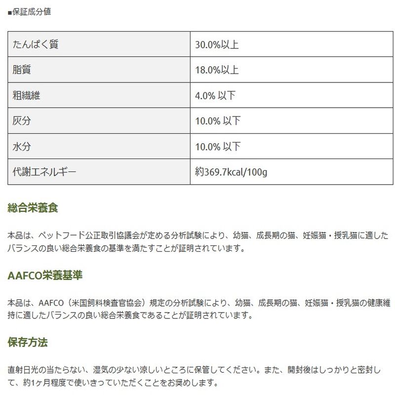 本品は、AAFCO(米国飼料検査官協会)規定の分析試験により、幼猫、成長期の猫、妊娠猫・授乳猫の健康維持に適したバランスの良い総合栄養食であることが証明されています。