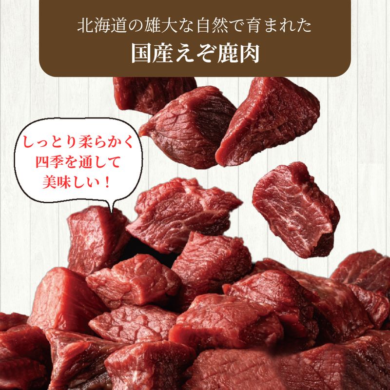 主原料には希少な国産エゾ鹿トライプを約20%使用し、新鮮な馬肉と合わせて低温乾燥製法で仕上げました。